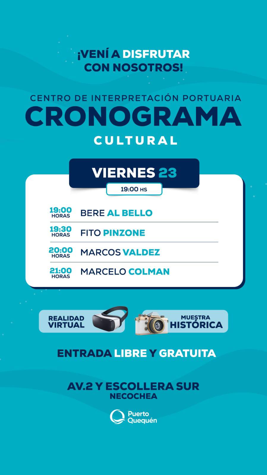 Puede ser una imagen de instrumento musical y texto que dice "¡VENÍ A DISFRUTAR CON NOSOTROS! CENTRO DE INTERPRETACIÓN PORTUARIA CRONOGRAMA CULTURAL SABADO 24 19:00 HS 19:00 HORAS VOCAL KINGDOM 20:30 HORAS PRISCILA SUAREZ 21:30 HORAS MIGUEL MERLO 22:00 HORAS CHANGO FISCINA REALIDAD VIRTUAL MUESTRA HISTORICA ENTRADA LIBRE ENTRADALIBREYGRAT Y GRATUITA AV.2YESCOLLERASUR ESCOLLERA SUR AV.2 NECOCHEA Puerto Quequén"