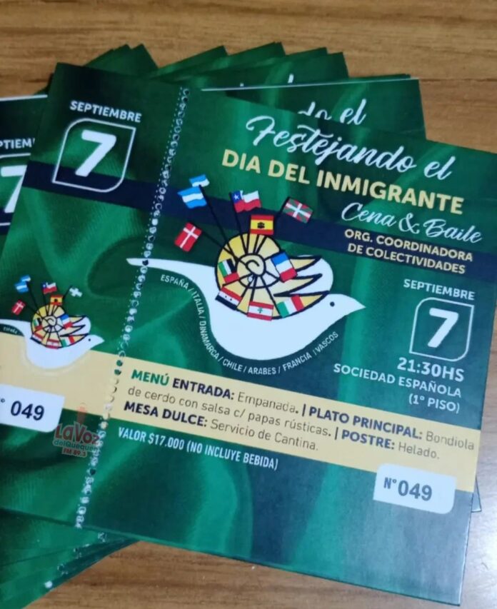 El encuentro social tendrá lugar en el salón de fiestas de la Sociedad Española el sábado 7 de septiembre y el menú consistirá en una empanada chilena a modo de entrada; el plato principal será bondiola con salsa y papas rústicas y de postre helado, a lo que se agregará una mesa de dulces con elaboraciones de las distintas colectividades.