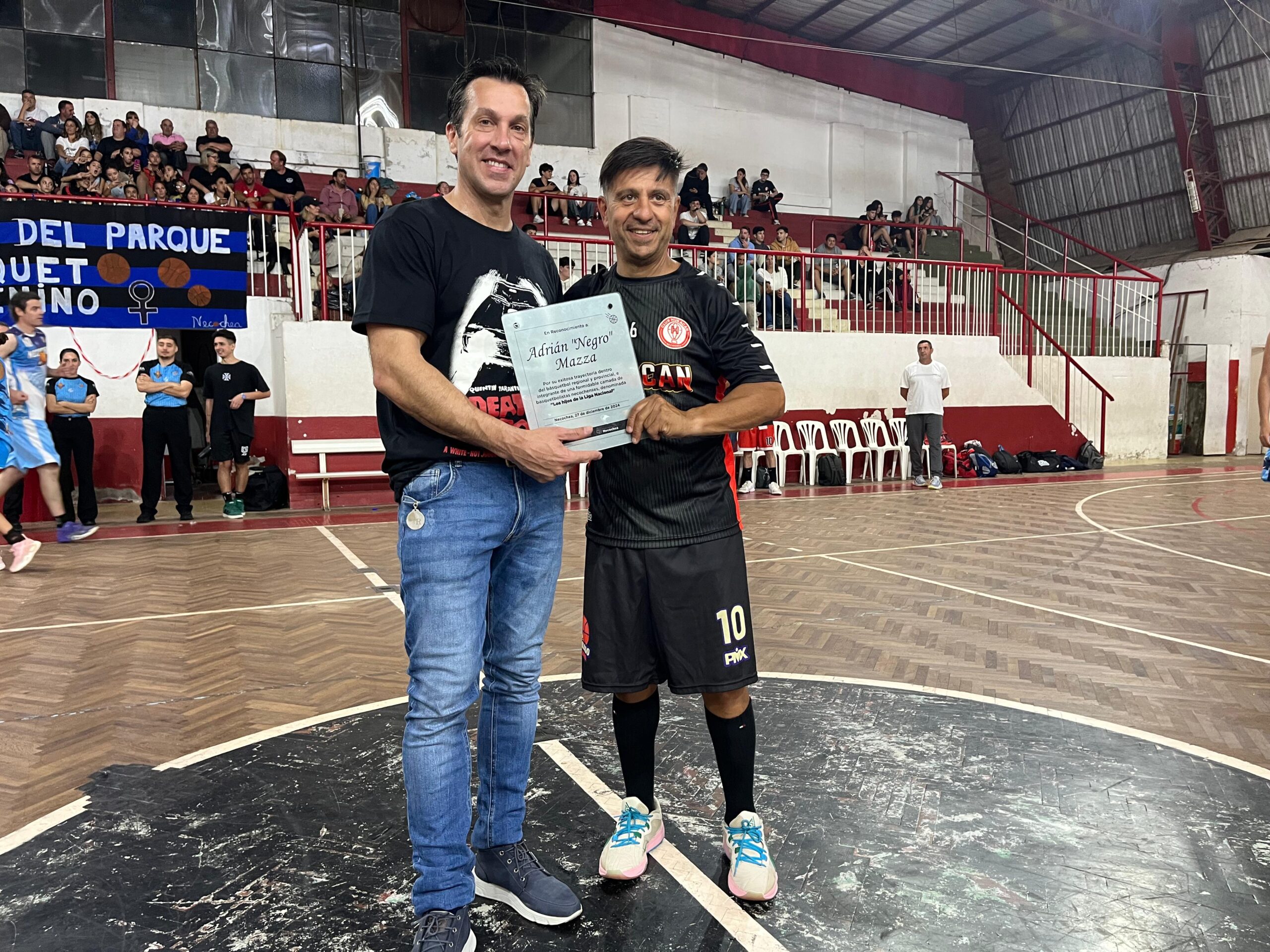 “Reconocimiento a Adrián «Negro» Mazza: Por su exitosa trayectoria dentro del básquetbol regional y provincial, e integrante de una formidable camada de basquetbolistas necochenses, denominada “Los hijos de la Liga Nacional”, fue el mensaje que se grabó en la placa entregada por Rojas al homenajeado de la noche, que también fue premiado por el Club Huracán y Alumni de Orense, además de recibir el cariño de todos los presentes.