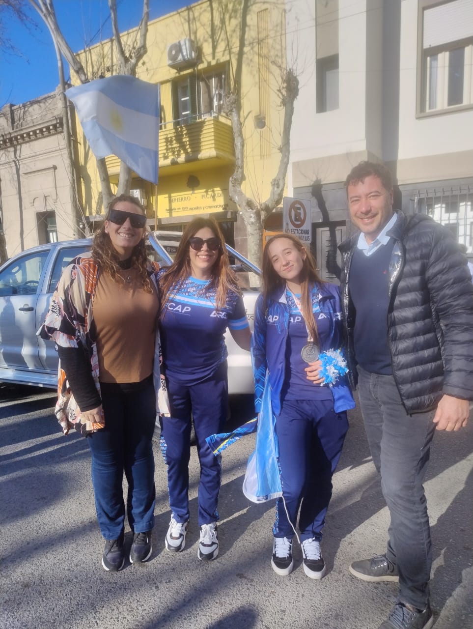Llegadas hace pocas horas a Necochea desde la experiencia en el país cafetero, Sophie Lacoste y su entrenadora recibieron una cálida bienvenida este lunes en la ciudad. Acerca de ello, la subcampeona lució su medalla plateada y expresó al salir del despacho que “estoy muy feliz y emocionada, fue muy lindo que estuvieran mi familia y amigos”.