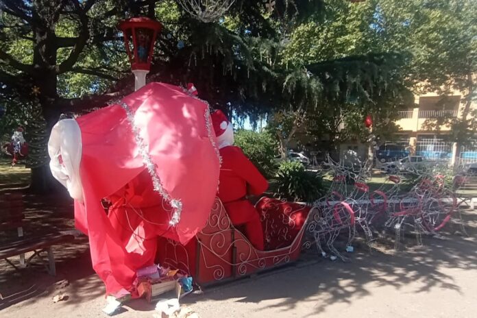 El lamentable acontecimiento se dio este domingo, cuando personas aun no identificadas quitaron la señalética de madera, desoldaron y rompieron los renos hechos con hierro que tiran el trineo, desgarraron la bolsa de regalos de Papá Noel y desprendieron una tira de luces del propio árbol.