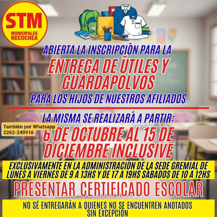 Desde el Sindicato de Trabajadores Municipales de Necochea informamos que ya se encuentra ABIERTA LA INSCRIPCIÓN para la entrega de útiles escolares y guardapolvos destinados a los hijos e hijas de nuestros afiliados.