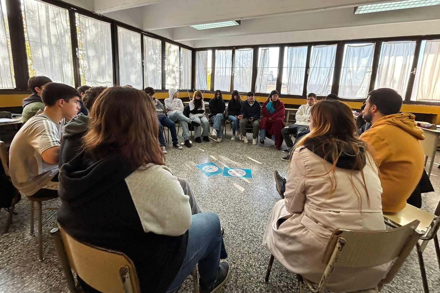 En la segunda parte del taller, el alumnado se dividió de a pares, sentados de manera enfrentada para poder conversar sobre sus intereses fuera de la escuela, descifrar si compartían actividades con sus compañeros y compañeras, o imaginar qué actividades podrían fomentar la inclusión en el aula; para terminar, volviendo a la ronda y contar al resto que aspectos no conocía de la persona con la que le tocó vivir la experiencia y de qué manera se podría cooperar con la inclusión.