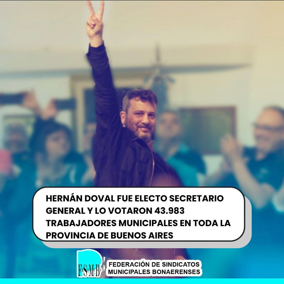 municipal de la Provincia de Buenos Aires. Con una masiva participación, Hernán Doval fue electo nuevo Secretario General de la Federación de Sindicatos Municipales Bonaerenses (FESIMUBO), obteniendo 43.983 votos en una elección que se desarrolló en 80 municipios de la Provincia de Buenos Aires y que contó con un padrón de más de 105.000 afiliados habilitados a votar.