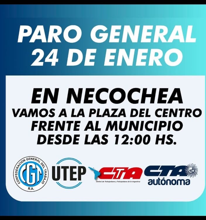 LA CGT de nuestra ciduad difundió al convocatoria oficial al paro general del 24 de enero contra el decreto 70/2023 del presidente Javier Milei y la ley ómnibus.