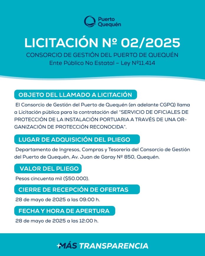 En el marco de aplicación del Código Internacional de Protección de Buques e Instalaciones Portuarias de la Organización Marítima Internacional, el Consorcio de Gestión de Puerto Quequén llama a Licitación pública N° 2/2025 para la contratación por dos años del “SERVICIO DE OFICIALES DE PROTECCIÓN DE LA INSTALACIÓN PORTUARIA A TRAVÉS DE UNA ORGANIZACIÓN DE PROTECCIÓN RECONOCIDA”.