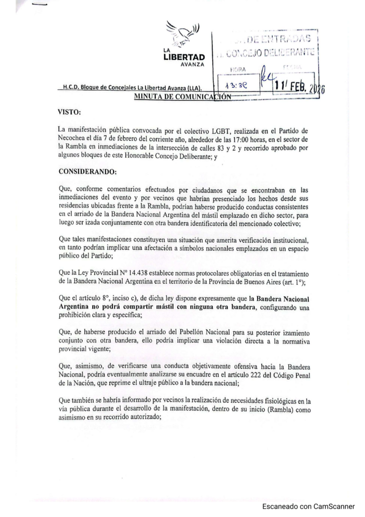 El bloque legislativo de La Libertad Avanza solicita, mediante un proyecto de minuta de comunicación dirigida al Departamento Ejecutivo, que éste informe si durante La Marcha del Orgullo se arrió la Bandera Nacional del mástil que se encuentra en La Rambla, reemplazando a nuestra insignia nacional por otra bandera, lo que significaría una violación a la Ley Provincial N° 14.438.