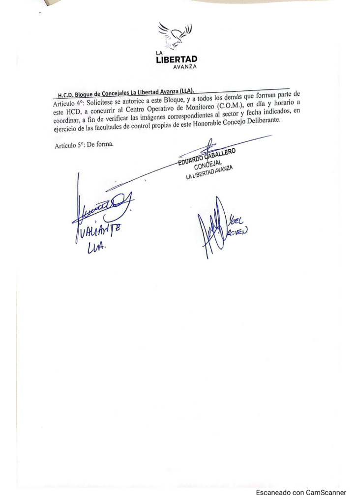 En ultima estancia, el bloque de concejales solicita autorización, tanto en forma personal como haciéndolo extensivo a los demás bloques legislativos que componen el Honorable Concejo Deliberante que se les permita concurrir al Centro de Monitoreo a fin de verificar las imágenes correspondientes al lugar y la fecha que motiva la presentación de esta minuta por los hechos ya relatados.