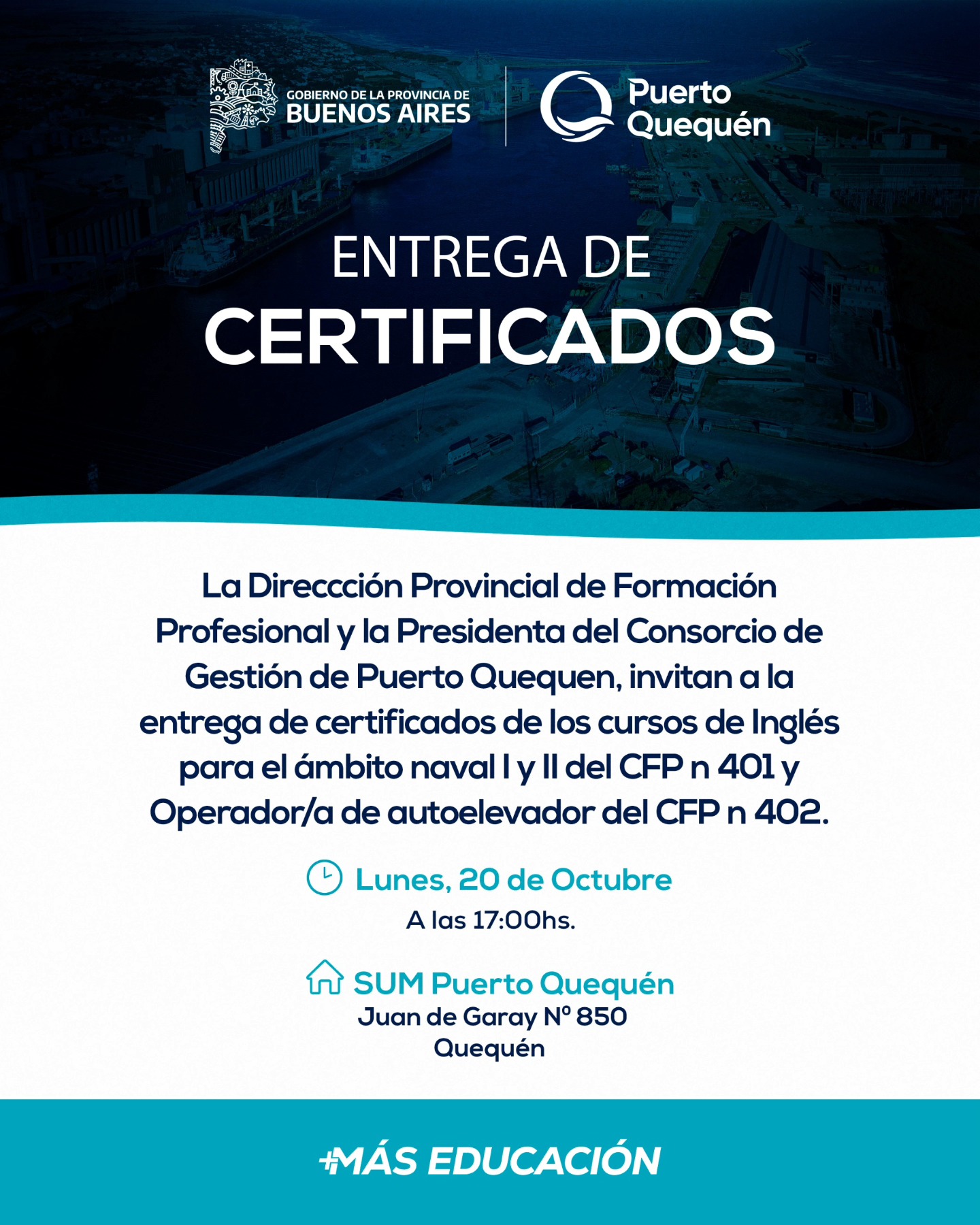 Con parte del objetivo cumplido, se invita a la entrega de certificados de las/los primeros egresados de los cursos de Formación Profesional que se dictaron en el marco de la articulación entre la Dirección Provincial de Formación Profesional y el Consorcio de Gestión de Puerto Quequen a cargo de la Lic Jimena López.