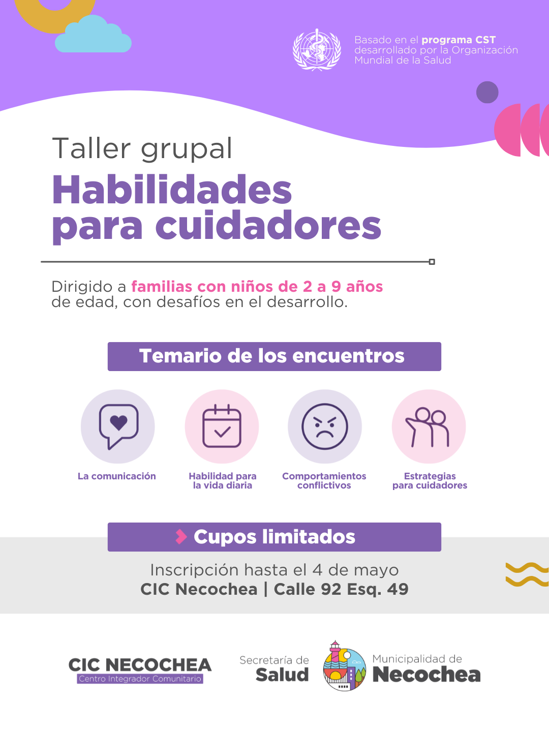 La Secretaría de Salud de la Municipalidad de Necochea, a través del Centro Integrador Comunitario (CIC), anuncia el lanzamiento del taller grupal “Habilidades para Cuidadores”, una iniciativa basada en el programa CST que desarrolla la Organización Mundial de la Salud (OMS), diseñada para brindar herramientas concretas a familias que atraviesan desafíos en el desarrollo infantil.