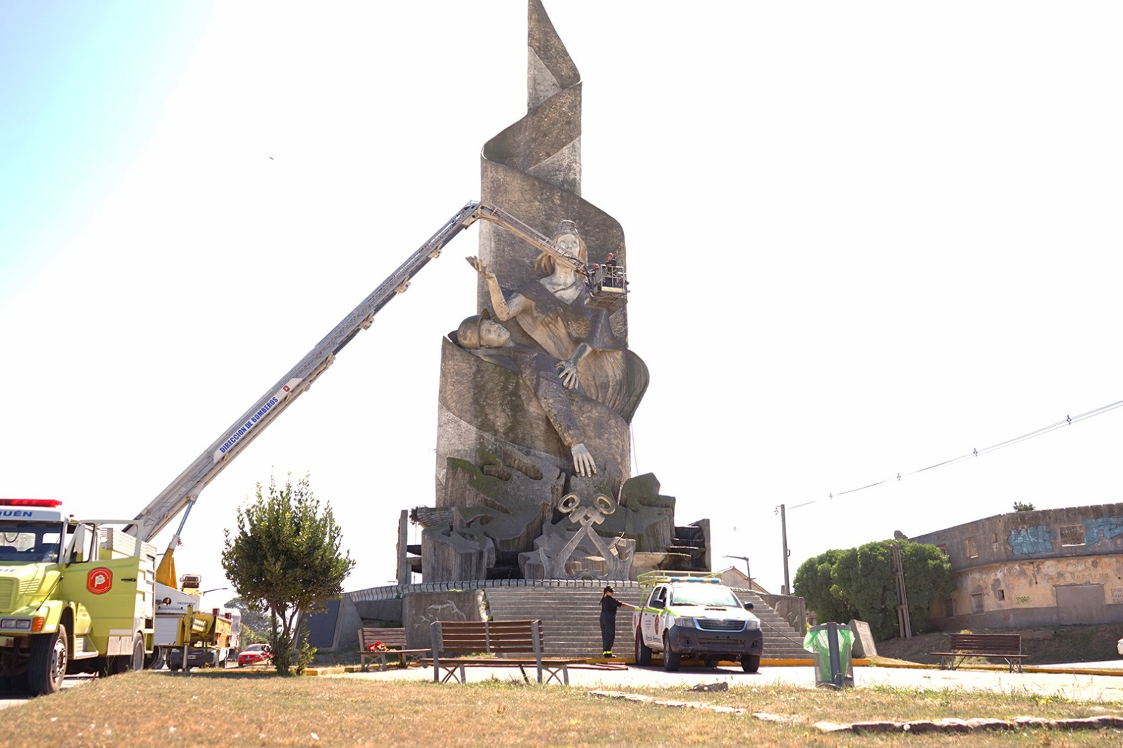 Los trabajos se desarrollan de manera articulada con los cuerpos de Bomberos de Necochea y Quequén, quienes colaboran en las tareas de hidrolavado de esta emblemática estructura, considerada una de las más imponentes del país en homenaje a la causa Malvinas.