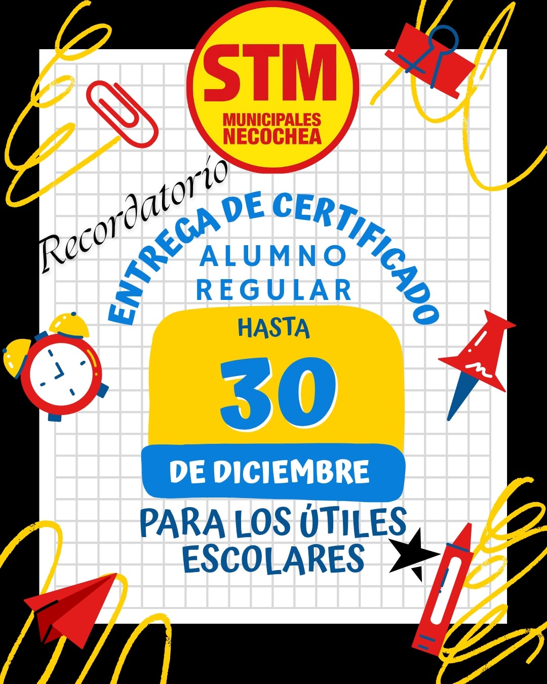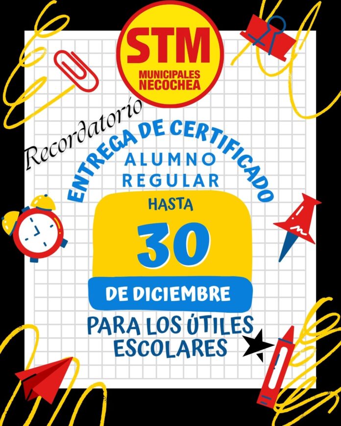 El Sindicato de Trabajadores Municipales Informa a sus afiliados y afiliadas que restan menos de 15 días para finalizar la inscripción de hijos e hijas que cursen nivel primario o secundario en el ciclo lectivo 2026, con el fin de acceder a la entrega de útiles escolares al inicio del ciclo.