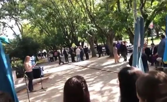 El escándalo ocurrió casi al comienzo de la jornada y frente a decenas de personas, entre las que también se encontraban familiares de los homenajeados, personal docente y estudiantes que estaban ubicados a un costado del atril junto con las banderas listas para entonar el himno nacional.