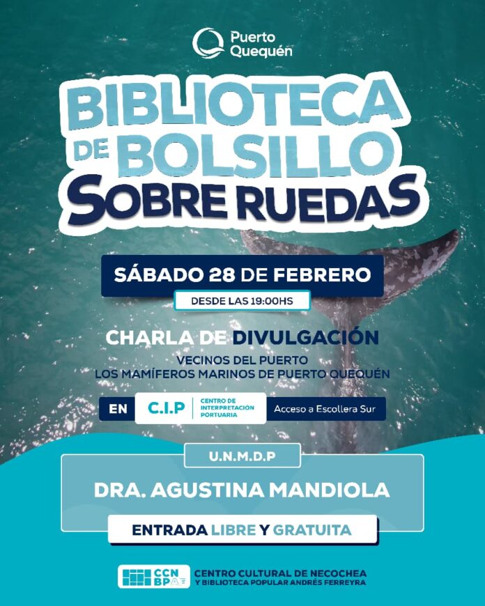 El Centro de Interpretación Portuaria (CIP) será escenario de una charla de divulgación sobre los mamíferos marinos de Puerto Quequén a cargo de la de Dra. Agustina Mandiola integrante del grupo de investigación «Biología, ecología y conservación de mamíferos marinos» Instituto de Investigaciones Marinas y Costeras. Facultad de Ciencias Exactas y Naturales. Universidad Nacional de Mar del Plata.